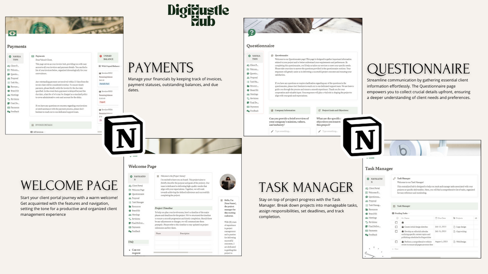 Includes 12 Pages: Client Portal Overview Page, Welcome Page, Questionnaire Page, Proposal Page, Task Manager Page, Resources Page, Brand Kit Page, Meetings Page, Revisions Page, Final Deliverables Page, Payments Page, Feedback Page