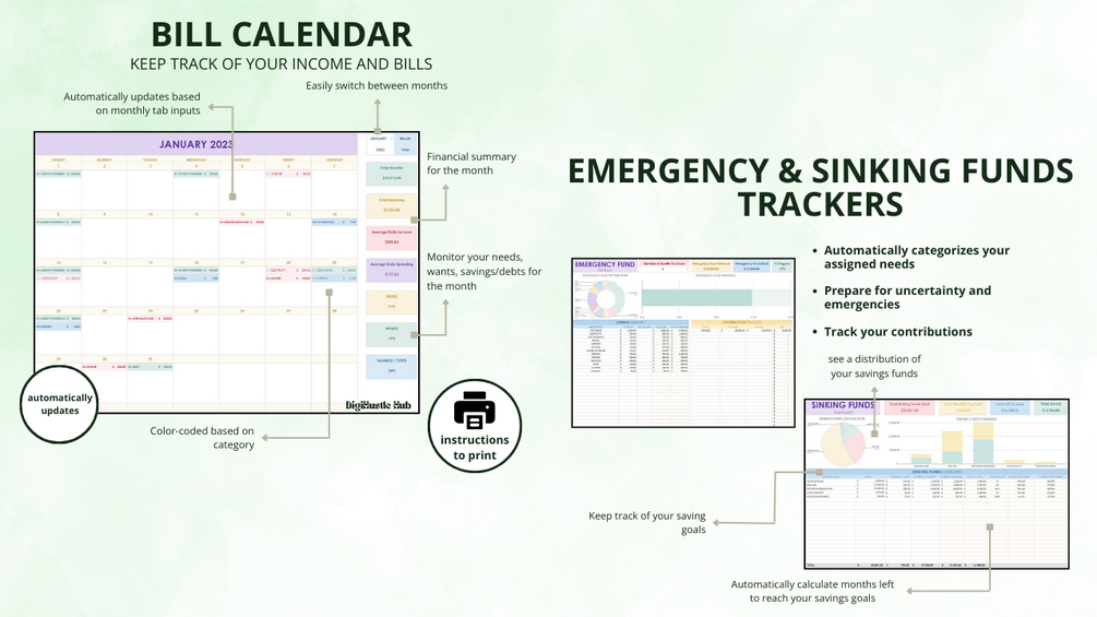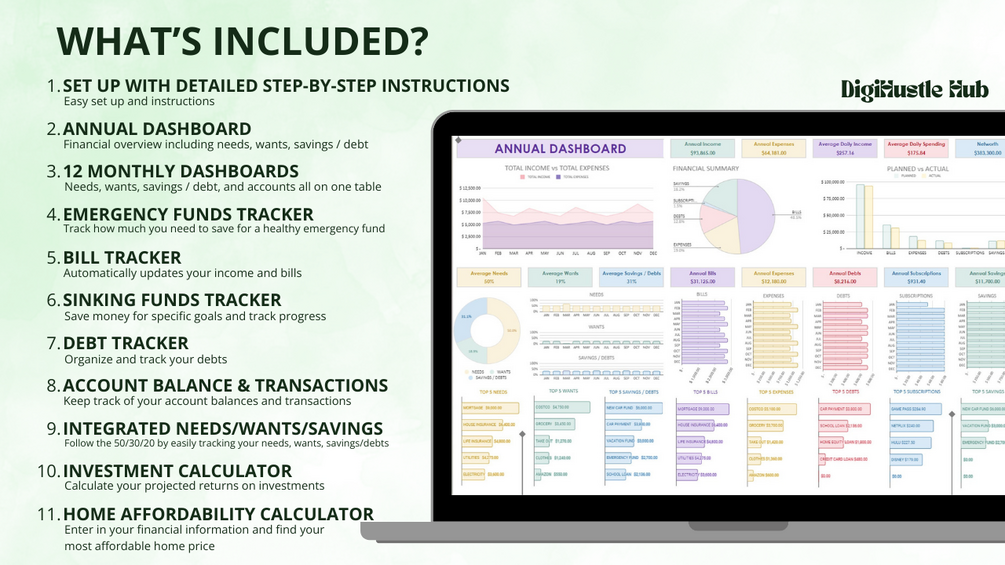 Includes 23 tabs: Instruction & Setup Tab, Annual Dashboard Tab, Annual Totals Tab, 12 Monthly Dashboards, Bill Calendar, Emergency Funds Tracker, Sinking Funds Tracker, Debt Tracker, Investment Calculator, Home Affordability Calculator, Net Worth Tracker