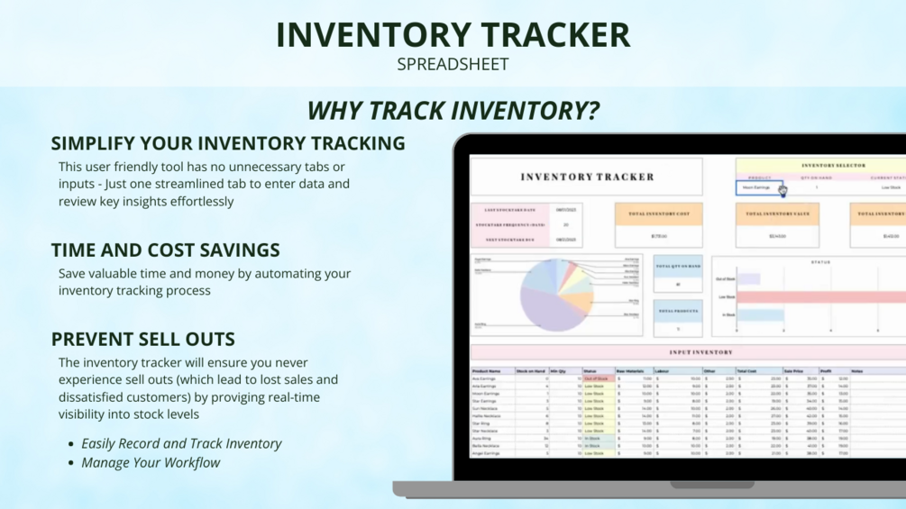 Streamline inventory management effortlessly! Our single-tab solution is perfect for businesses of all sizes. Track products, reorder points, and restock dates with a clean and intuitive interface. No more headaches from complicated software!